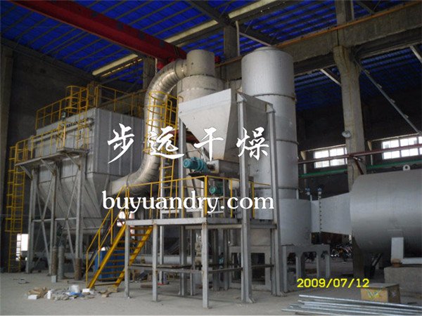 热空气切线进入干燥器底部,在搅拌器带动下形成强有力的旋转风场。膏状物料由螺旋加料器进入干燥器内,在高速旋转搅拌桨的强烈作用下,物料受撞击、磨擦及剪切力的作用下得到分散,块状物料迅速粉碎,与热空气充分接触、受热、干燥。脱水后的干物料随热气流上升,分级环将大颗粒截留,小颗粒从环中心排出干燥器外,由旋风分离器和除尘器回收,未干透或大块物料受离心力作用甩向器壁,重新落到底部被粉碎干燥。